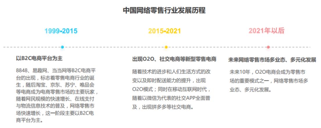 20年前,8848、易趣网、当当网等B2C电商的出现,标志着零售电商模式的诞生,随后淘宝、京东、苏宁、唯品会等电商成为电商零售市场的主要玩家;随着网民规模的快速增长、在线支付与物流信息技术的普及,网络零售市场快速增长,这一阶段主要以B2C、C2C电商平台为主。过去十年来,随着技术的进步和人们生活方式的改变以及即时配送能力的提升, O2O模式出现并逐渐成熟;未来一段时间,随着消费者的线上消费、即时性消费习惯逐步养成,以及线上线下全渠道零售融合发展, O2O电商也将成为网络零售市场的重要模式之一。