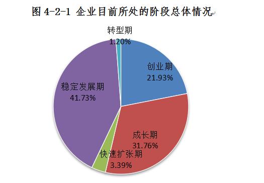 从本次调查企业所处阶段来看,41.73%的企业处于稳定发展期,31.76%的企业处于成长期,另外还有21.93%的企业处于创业期。