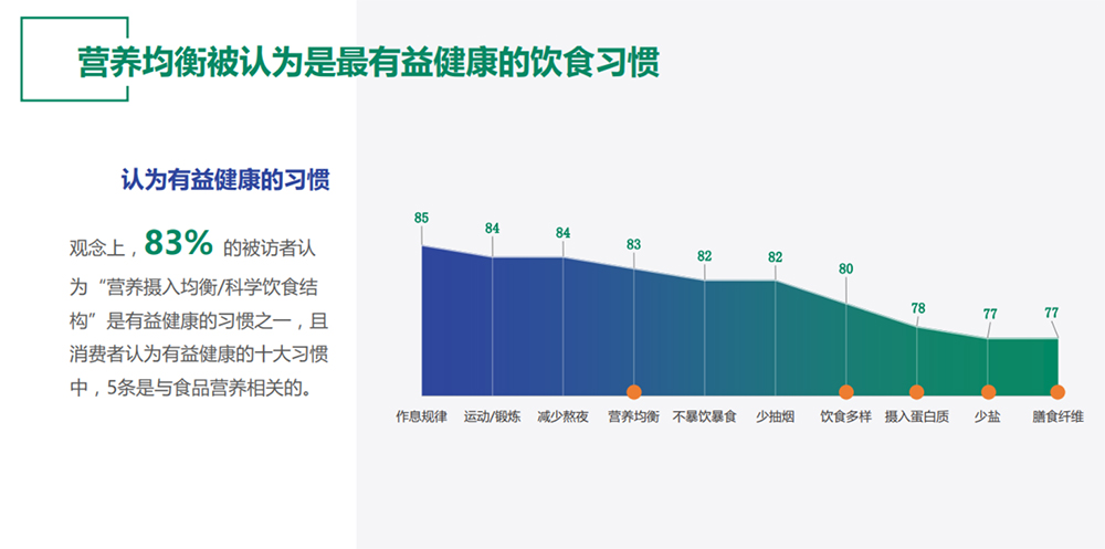 观念上,83% 的消费者认为“营养摄入均衡/科学饮食结构”是有益健康的习惯之一,且消费者认为有益健康的十大习惯中,五条是与食品营养相关的。从人群来看,对健康的关注度随着年龄增加而提高,30岁+以上、有孩、一线城市是高健康关注度人群。