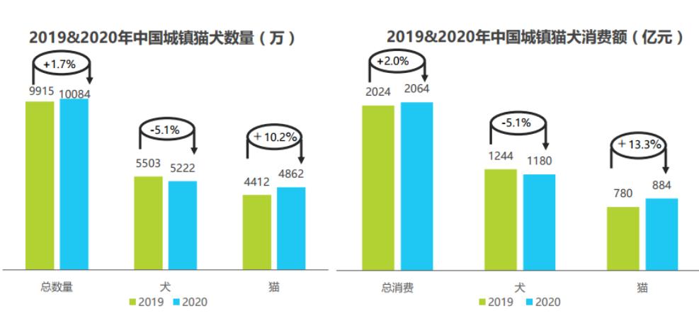 二、猫犬宠物总数量和消费:猫犬宠物总数量同比微增,其中犬数量下滑,猫数量上升