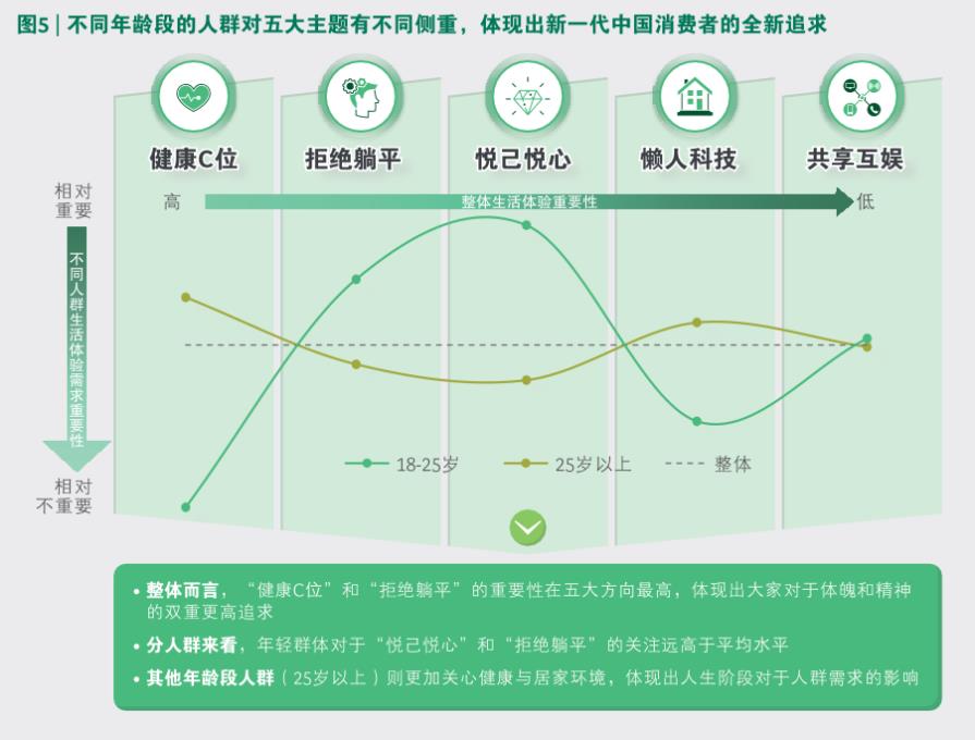 从细分人群来看,我们注意到新一代(18-25岁)中国消费者对五大主题展现出不同的侧重,他们更看重知识扩充和形象提升,对健康和家庭生活则不那么关注,同时不同年龄段的人群对丰富娱乐体验的重视程度旗鼓相当(参阅图5)。