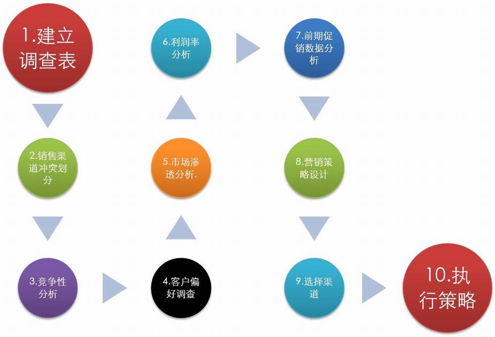 1)建立完整的营销渠道调查表,通过销售业务员、代理商、直销商、电话销售、OEM、零售网点、展览会、网上销售等渠道获得基本信息;
