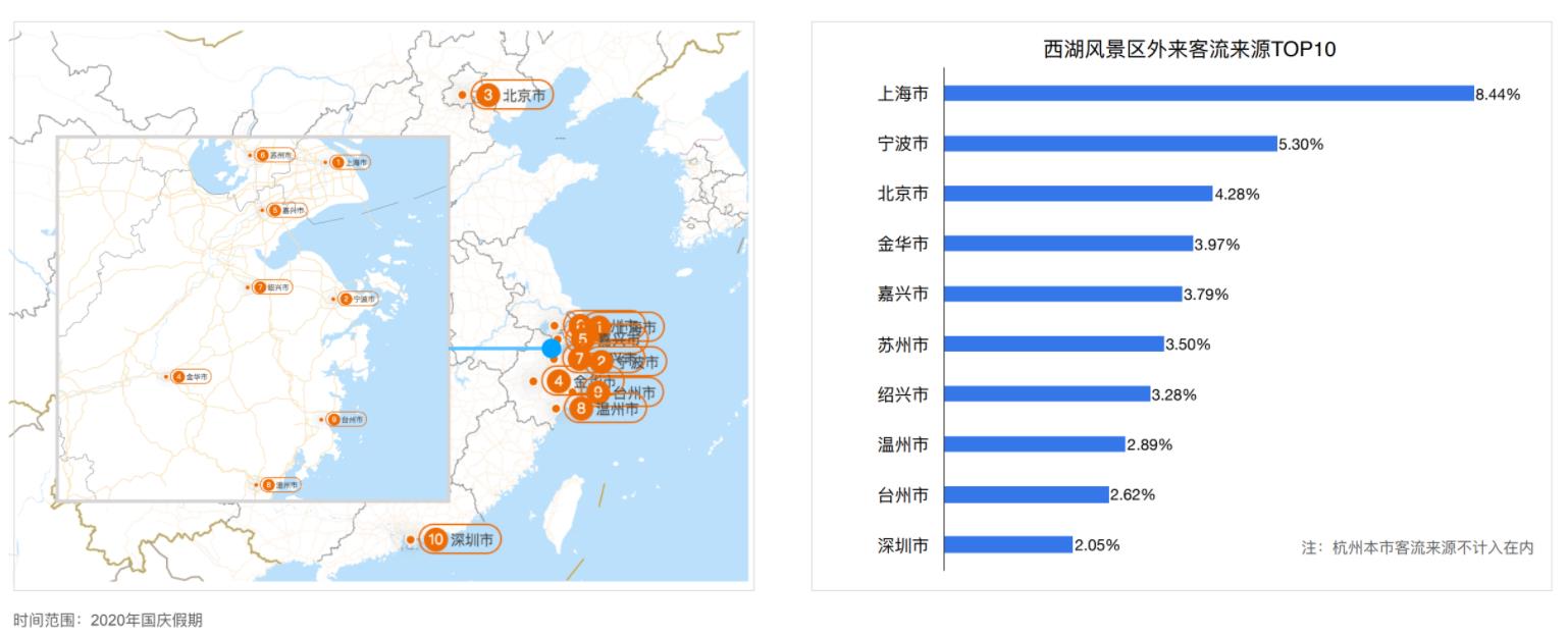 从西湖风景区外来客流来源地来看,本省城市仅占了前十中6位,其余城市分别是上海、苏州、北京、深圳。