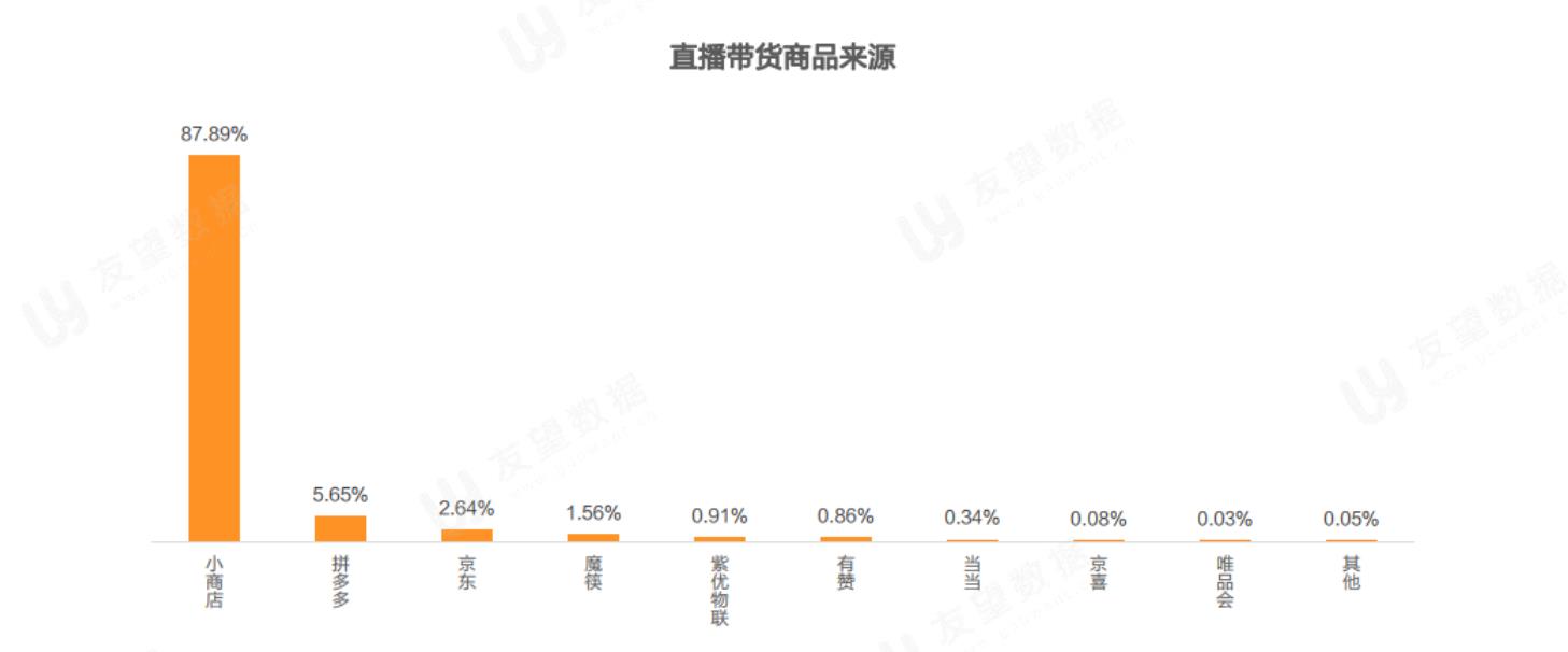 据友望数据统计,直播带货商品中,有87.89%来自小商店。其次是拼多多、京东、魔筷等商城,占比不到 10%,其余的商城占比都不到1%,京喜、唯品会等商城占比甚至不足0.1%。