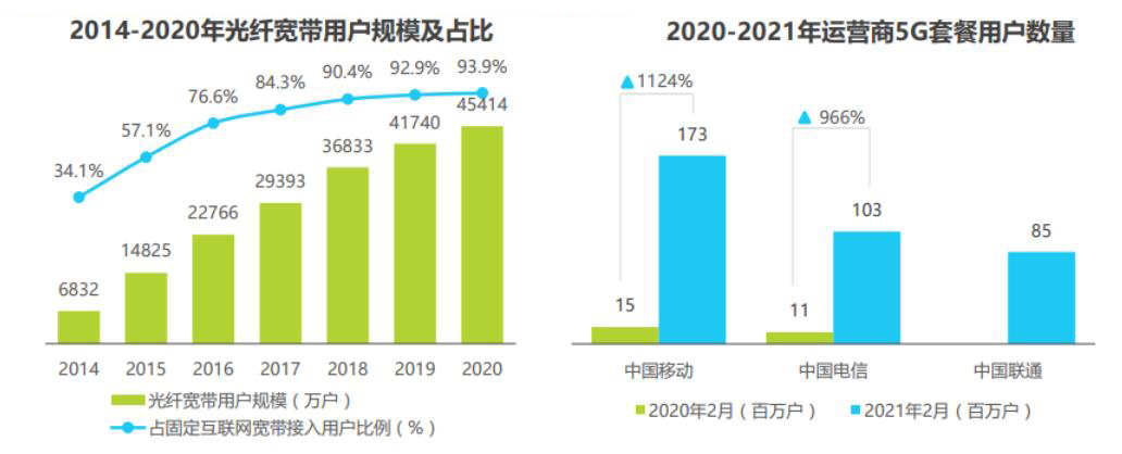 互联网基础设施的完善是智能视觉摄像头产业发展的先决条件。自2014年至2020年,我国光纤宽带用户规模持续增加,从6千万增长至4.5亿,极大地扩充了家用智能视觉产品的潜在用户规模。在新型无线网络技术方面,5G和WiFi 6将形成互补共存的关系,凭借其高速率和低延时的特性,赋能智能家居行业。2020年下半年国内运营商大规模集采WiFi6产品, WiFi 6射频芯片巨头Qorvo和华为、TP-Link等业内厂商均预计未来三年内WiFi 6将成为市场主流。在5G建设与运用方面,截至2021年2月,三家电信运营商5G套餐用户总数达3.61亿户,其中中国移动同比增速达1124%,中国电信同比增速达 966%,整体长势迅猛。5G和WiFi 6技术的应用能够降低智能产品数据传输的时延 ,增强智能视觉监控的时效性,方便用户实时同步地看护家中老幼和监控家中情况。同时 ,高速带宽也可以支持更高分辨率的视频进行传输,为后续视频分析、识别的开展创造了充分的条件,便于用户更清楚地跟进家中实际情况。