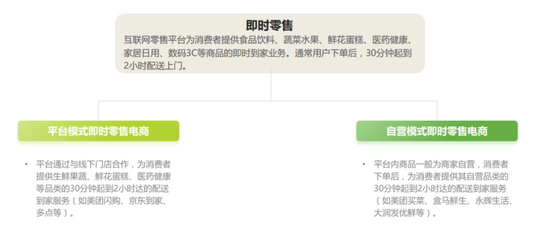 中国即时零售行业内玩家主要分为两种商业模式 ∶平台模式和自营模式。平台模式即时零售电商不直接拥有商品,通常依托互联网能力将线下的商家商品和线上的消费需求形成链接,部分提供线下即时配送运力服务;自营模式多出现在垂直零售行业,对商品和供应链的控制能力较强。
