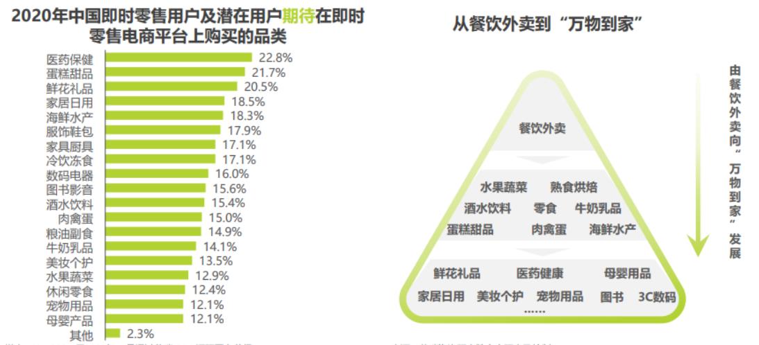 疫情催化本地即时零售需求,万物到家新时代将加速到来疫情催化了消费者本地即时零售需求,大大加速了消费者教育进程,消费者的即时性需求大幅提升。随着消费者消费习惯的变化以及行业的发展,即时零售电商平台可购买的品类也在不断扩展。从需求端来看,根据艾瑞调研数据,消费者期待在即时零售电商平台上购买的品类占比相对均衡 ,对各类商品都有即时消费需求;从供给端来看,当下本地生活服务已从餐饮外卖延伸至生鲜水果、家居日用、鲜花礼品、医药健康、图书文创等各类商品,即时零售场景也涵盖商超、便利店、药店、书店等线下场所,万物到家新时代将加速到来。