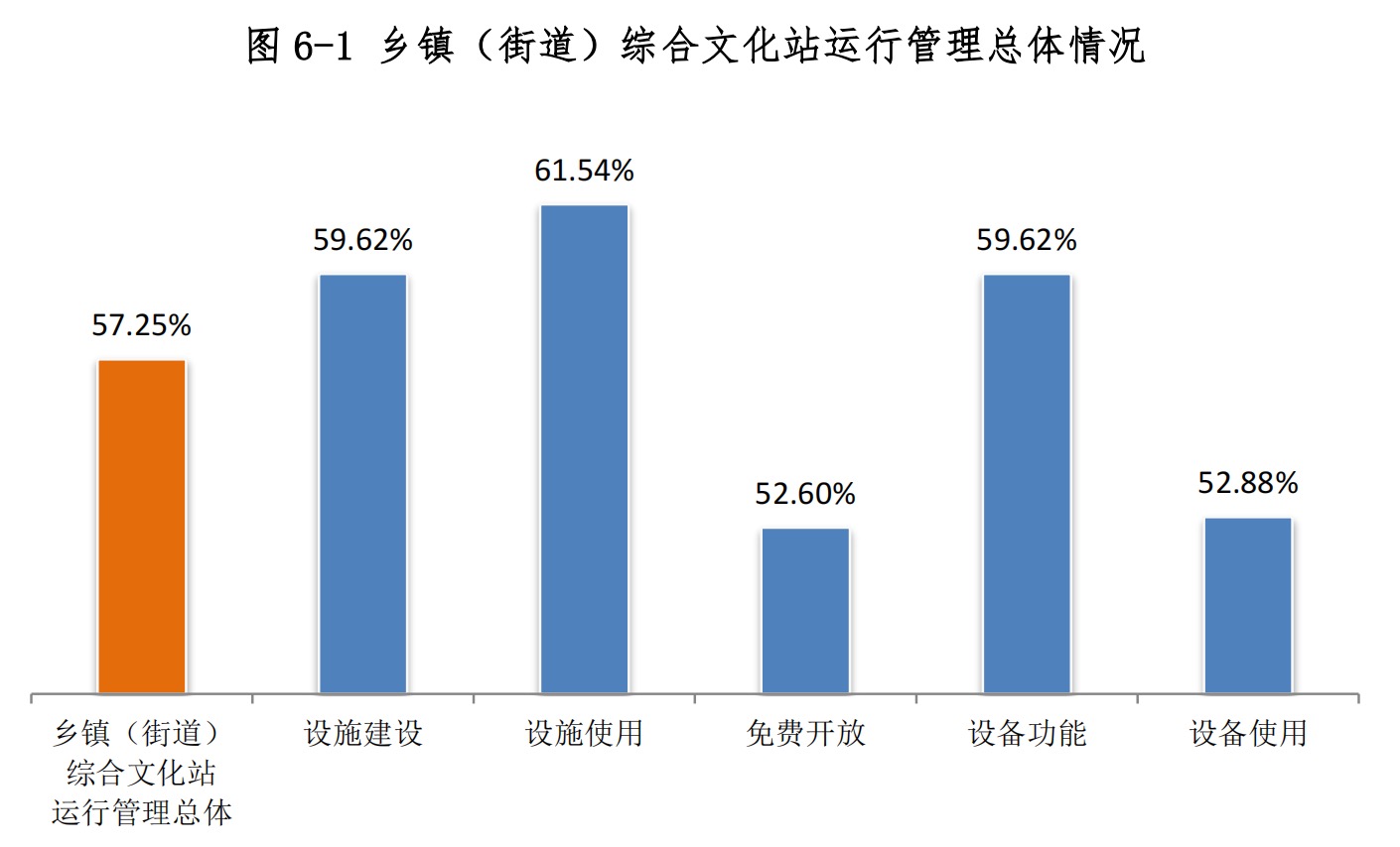 调查结果显示,乡镇(街道)综合文化站运行管理总体得分率为57.25%。其中设施使用(61.54%)得分率相对最高,其次是设施建设和设备功能,得分率均为 59.62%,免费开放方面知晓率相对最低,为52.60%。