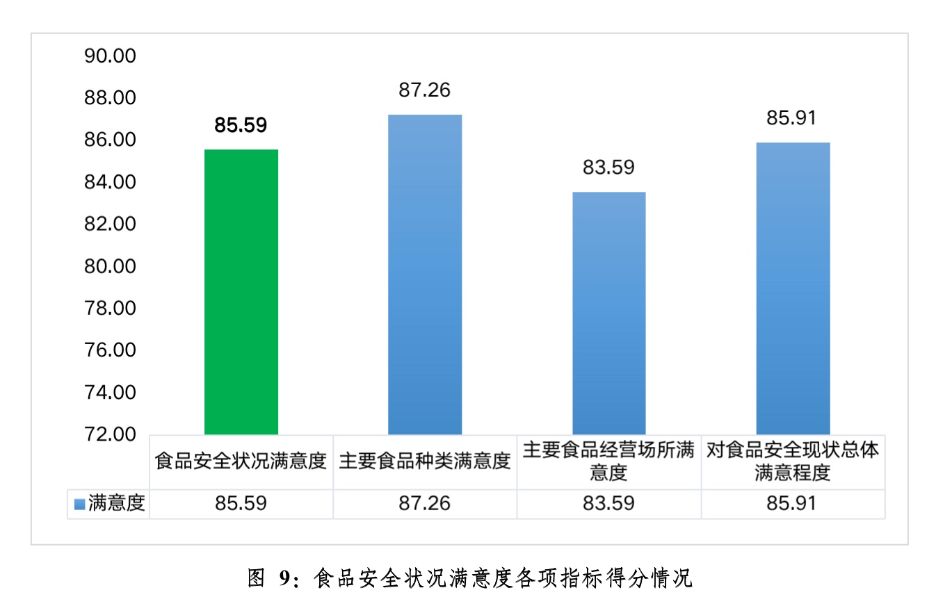 从调查结果来看,食品安全状况满意度各项二级指标中,主要食品种类满意度得分最高,满意度为87.26分;其次为对食品安全现状总体满意程度,满意度为85.91分;主要食品经营场所满意度相对较低,为83.59分。