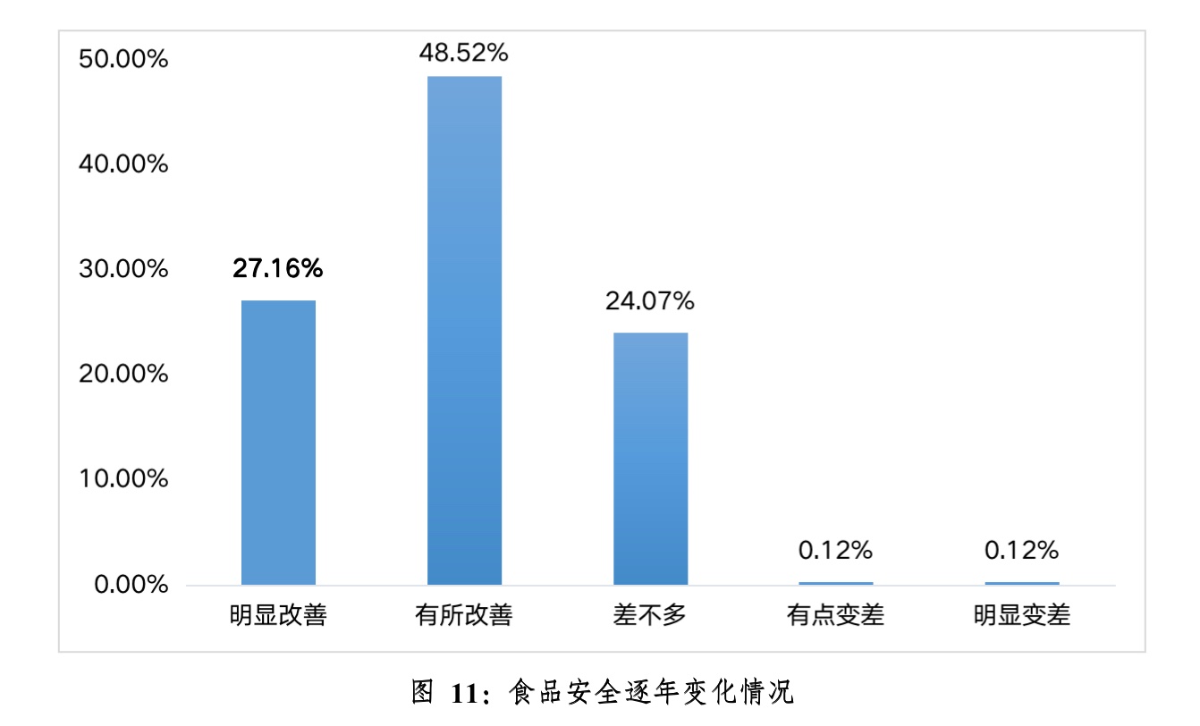 从调查结果来看,群众对食品安全逐年变化情况的满意度为80.46分。在问及“与过去的一年相比,您感觉本地食品安全状况的变化趋势是?”,75.68%[ 百分比保留两位小数,未做机械调整,可能出现0.01%误差,下文同。]的受访客户认为“明显改善”和“有所改善”。其中,认为“明显改善”的占比27.16%,认为“有所改善”的占比48.52%,认为“差不多”的占比24.07%,仅0.24%的群众认为“有点变差”和“明显变差”。