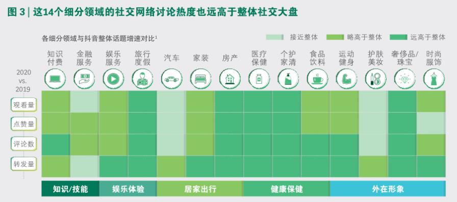 调研数据显示,过去几年,中国消费市场中14个细分领域的变化显著影响着消费者的生活,未来人们也愿意在这些领域购买更好的产品(参阅图2)。此外,这14个领域的社交网络讨论热度也远高于整体社交网络的大盘热度,反映出人们对于这些领域深入了解的意愿(参阅图3)。