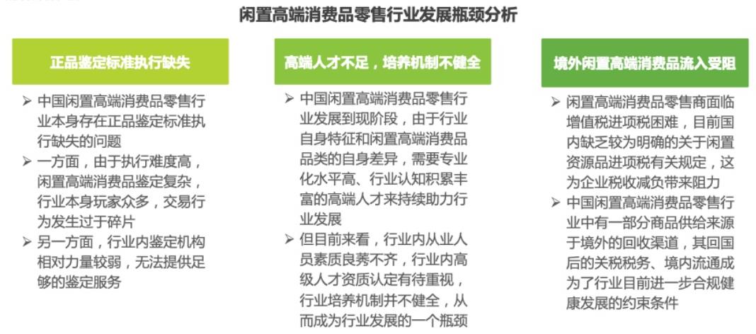 中国闲置高端消费品零售行业借助消费互联网化的红利持续释放,正在进入快速发展期,但行业发展也受到了高端人才不足、闲置高端消费品的正品鉴定标准缺失、闲置高端消费品的定价不公允、境外奢侈品的市场引入机制不畅通等发展瓶颈。政府作为闲置高端消费品零售行业的政策制定者和行业监管者,应该在行业健康合理有序发展上提供相关指引和政策措施的有效落地。