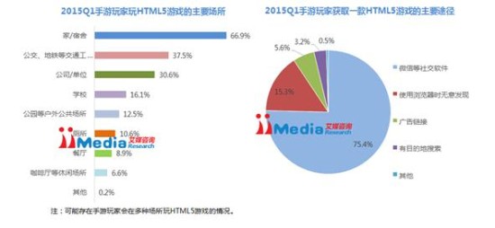 iiMedia Research(艾媒咨询)数据显示,2015Q1,在手游玩家玩HTML5游戏时的场景分布方面, 66.9%的玩家会在家/宿舍玩手游; 37.5%的玩家会在公交、地铁等交通工具上玩手游。在获取HTML5游戏的途径上,有75.4%的玩家则是通过微信等社交软件获取、使用一款HTML5游戏。15.3%的玩家是在使用浏览器时无意中发现了HTML5游戏而使用的。